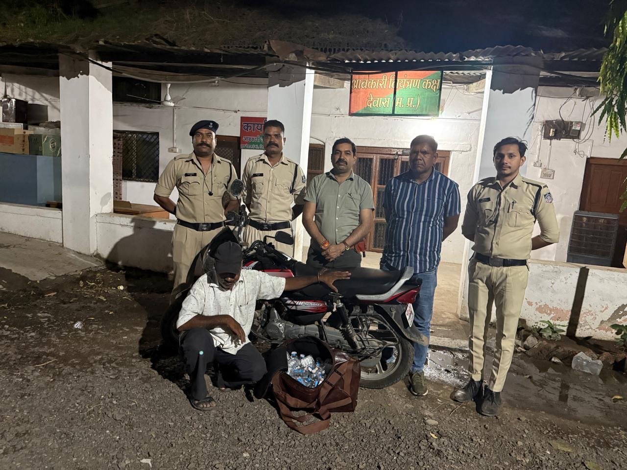 कलेक्टर महोदय देवास ऋतुराज सिंह के निर्देशन तथा सहायक आबकारी आयुक्त श्रीमती मंदाकिनी दीक्षित के* मार्गदर्शन में आबकारी देवास द्वारा अवैध मदिरा के निर्माण, विक्रय एवं परिवहन करने वालों के विरुद्ध लगातार कार्यवाही की जा रही है जिसमें दिनांक 06.07.2025 को आबकारी वृत्त देवास ब में मुखबिर सूचना के आधार पर बाईपास जेल चोराहे के पास एक मोटरसाइकिल क्रमांक MP41 MW को रोककर विधिवत तलाशी लेने पर गाड़ी पर चालक के आगे रखे बैग से 100 पाव देशी मदिरा प्लेन बरामद हुई जो चालक द्वारा अवैध रूप से संग्रह कर परिवहन किए जाने से उसके विरुद्ध मध्य प्रदेश आबकारी अधिनियम 1915 की धारा 34(1) के तहत प्रकरण पंजीबद् कर विवेचना में लिया गया जप्त सामग्री एवं वाहन का बाजार मूल्य लगभग रुपए 67000 है ।